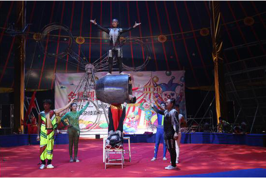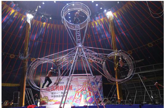 除了這些,雜技團(tuán)還表演了草帽飛舞、同時轉(zhuǎn)120個呼啦圈,還有浪橋飛人、雙人飛天等空中雜技。最后的死亡飛輪,演員們用生命挑戰(zhàn)高空+高速,動作驚險(xiǎn)萬分,更是挑戰(zhàn)觀眾心理承受極限。在幾十米空中飛旋、跳躍,沒有防護(hù),沒有鋼絲,只有對伙伴的信任和平日訓(xùn)練的經(jīng)驗(yàn)。